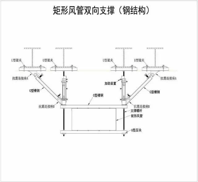3.2抗震支吊架的形式和承重支吊架一樣也有很多種,主要有:?jiǎn)喂芸拐鹬У跫?、門型多管抗震支吊架、電氣系統(tǒng)管道抗震支吊架、風(fēng)管抗震支吊架、綜合管道抗震支吊架、及設(shè)備抗震支吊架等。