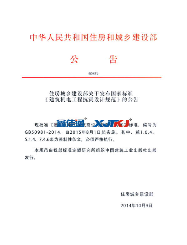 根據(jù)《中華人民共和國(guó)建筑法》和《中華人民共和國(guó)防震減災(zāi)法》,實(shí)行以"預(yù)防為主"的方針,經(jīng)抗震加固后的建筑給水排水、消防、供暖、通風(fēng)、空調(diào)、燃?xì)?、熱力、電力、通訊等機(jī)電工程設(shè)施,當(dāng)遭遇到本地區(qū)抗震設(shè)防烈度的地震發(fā)生時(shí),可以達(dá)到減輕地震破壞,減少和盡可能防止次生災(zāi)害的發(fā)生,從而達(dá)到減少人員傷亡及財(cái)產(chǎn)損失的目的。機(jī)電抗震支架系統(tǒng)是限制附屬機(jī)電工程設(shè)施產(chǎn)生位移,控制設(shè)施振動(dòng),并將荷載傳遞至承載結(jié)構(gòu)上的各類組件或裝置。2015年住房城鄉(xiāng)建設(shè)部發(fā)布國(guó)家標(biāo)準(zhǔn)《建筑機(jī)電工程抗震設(shè)計(jì)規(guī)范》公告:批準(zhǔn)《建筑機(jī)電工程抗震設(shè)計(jì)規(guī)范》為國(guó)家標(biāo)準(zhǔn),編號(hào)為:GB 50981-2014,自2015年8月1日期實(shí)施。