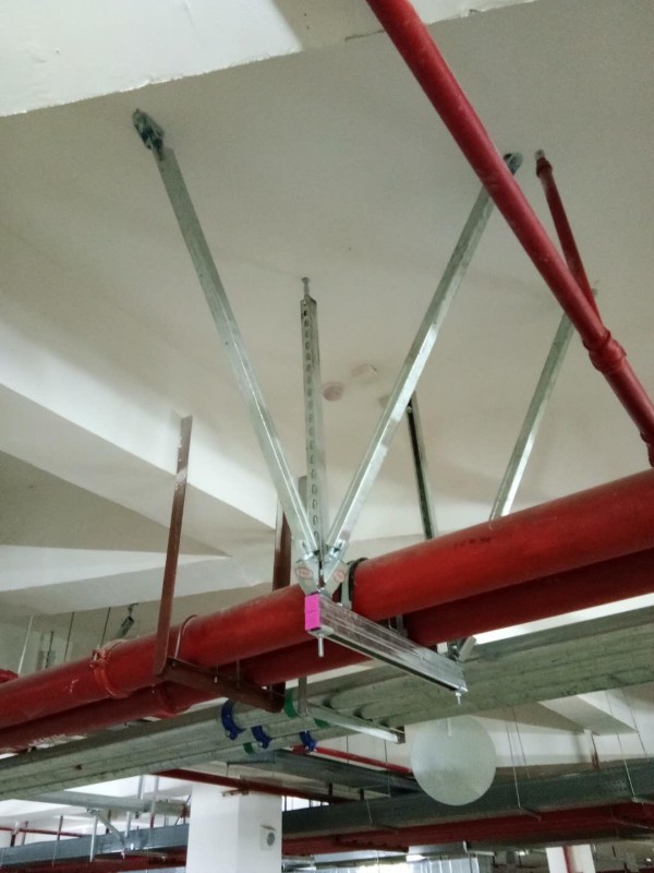消防管道抗震支架安裝側(cè)向支撐又安裝縱向支撐,其作用原理是在管道質(zhì)心水平面上形成互成90°的4個(gè)方向上的支撐,水平地震力從任意方向作用,管道均受到保護(hù)。成90°安裝的兩個(gè)剛性支撐,因其同時(shí)具有抗拉壓能力,所以能對(duì)管道作水平方向的保護(hù);對(duì)柔性支撐,則須做水平面上互成90°的4個(gè)支撐。因此,抗震支吊架對(duì)斜撐、吊桿的性能有更加嚴(yán)格的要求。