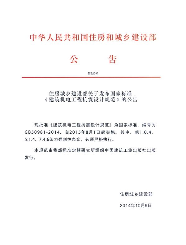 依據(jù)2015年住房城鄉(xiāng)建設(shè)部發(fā)布實施的國家標(biāo)準(zhǔn)GB50981-2014《建筑機(jī)電工程抗震設(shè)計規(guī)范》,其中明確規(guī)定了抗震支吊架的設(shè)計與使用。該標(biāo)準(zhǔn)自2015年8月1日起實施,也意味著自此之后的建筑機(jī)電工程必須要考慮抗震支吊架了。