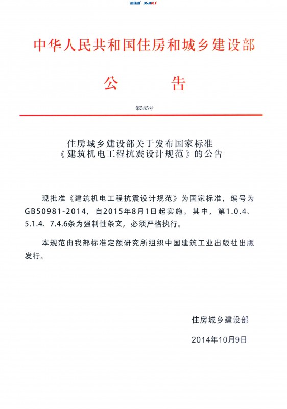 2014年10月9日,中華人民共和國住房和城鄉(xiāng)建設(shè)部第585號文件:住房城鄉(xiāng)建設(shè)部關(guān)于發(fā)布國家標準《建筑機電工程抗震設(shè)計規(guī)范》的公告,批準《建筑機電工程抗震設(shè)計規(guī)范》為國家標準,編號為GB50981-2014,自2015年8月1日起實施。其中,第1.0.4、5.1.4、7.4.6條為強制性條文,必須嚴格執(zhí)行。所以,自2015年8月1日之后出具圖紙或出具圖紙審查報告的工程,均需設(shè)置建筑機電工程抗震支吊架。