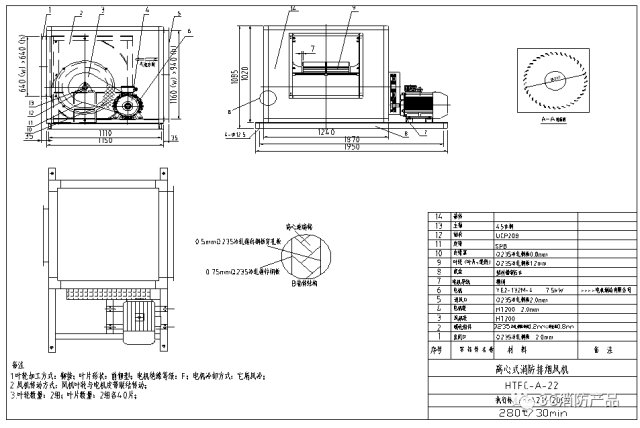 ③ 必須標(biāo)注葉輪(葉片+輪轂)、外殼材質(zhì)及厚度。材質(zhì)標(biāo)注應(yīng)明確(如Q235冷軋鋼板)。
