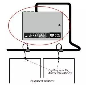 典型的吸氣式感煙火災探測器的安裝方式,所有盤內(nèi)的空氣樣品透過軟管匯流到采樣管送到探測主機進行煙霧檢測,利用管路及軟管抽取機柜內(nèi)部的空氣進行分析。