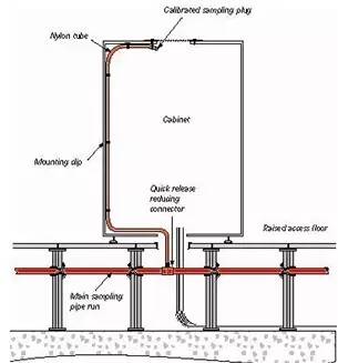 吸氣式感煙火災探測器的采樣管路配置相當靈活,采樣管可以配置在機柜上方,利用軟管及機柜上方的開孔即可抽取機柜內(nèi)部的空氣。采樣管路也可以配置在機柜下方,利用軟管延伸到機柜內(nèi)部的頂端來抽取空氣樣本。