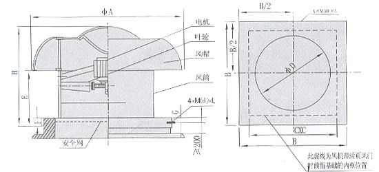 b、離心式屋頂風(fēng)機(jī):代號(hào)為DWT-II,型、DWT-III型二種型式,適用于風(fēng)量較小而壓力要求較高的場(chǎng)合。