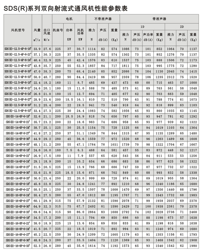 SDS系列射流風(fēng)機(jī)規(guī)格自(1)400mm—①1600mm,分單向運(yùn)轉(zhuǎn)軸流風(fēng)機(jī)和可逆式(雙向)運(yùn)轉(zhuǎn)軸 流風(fēng)機(jī)二大類,最大推力有3500N,對(duì)任一負(fù)荷和工況均可選擇高效、低噪聲的風(fēng)機(jī)。